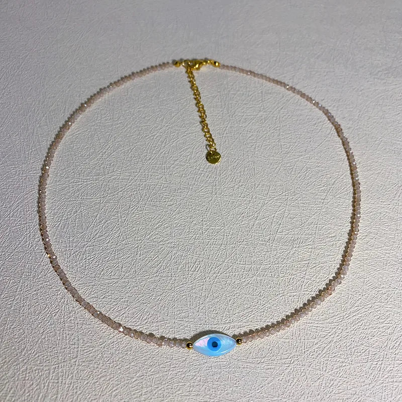 Elegant and meaningful, this necklace features beige-toned crystal that shimmers softly in the light, accented with a gold-plated evil eye pendant for a touch of protection and style. Finished with a gold-plated adjustable clasp, it blends minimalist sophistication with symbolic charm. Perfect for everyday wear or layering.